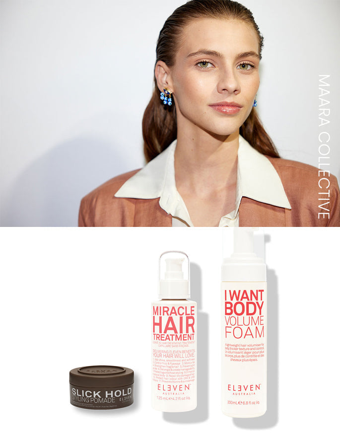 "This look was all about a natural finish and a beautiful, healthy shine. It was all about minimalism and softness. Damp hair was prepped with MIRACLE HAIR TREATMENT to hydrate the hair, prevent split ends, and enhance the hair's natural shine. We then pulled it back into a low ponytail with a slight bend through the mid-lengths to encourage movement. We finished the style off with GIVE ME HOLD FLEXIBLE HAIRSPRAY for control that also kept the hair looking soft and natural." JS
